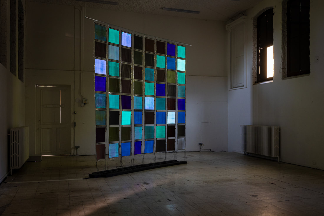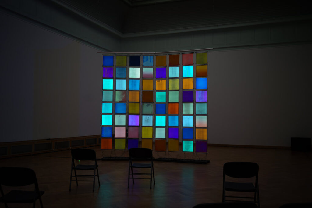 The size of the installation and number of foils depend mostly on the dialogue of the work with the architectural and acoustic properties of the space. When a location for the installation is known, we work on a proposal that fits the space. The work is totally modular and can have different sizes and shapes, so a space with a different size will get a different grid arrangement. It could be just one line of many fields, or just one or two foils to put it extremely. Each panel is screen printed, and because of our individual approach to printing and coloring, every panel is unique in color, blend, and texture. The composition, the sounds, and consequently the intensity and illumination are also treated individually.