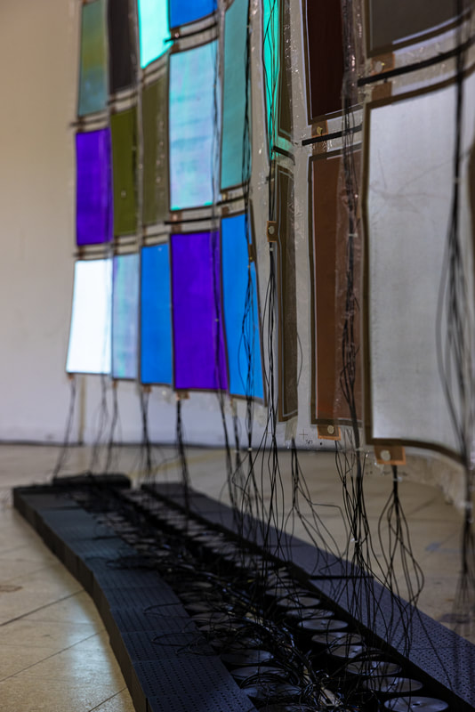 Unexpectedly, while collaborating with engineers from the University of Hasselt, we found that these foils could also serve as a light source. My previous work with these foils dates back to 2009, in the Permafrost installation, where they were used solely as microphone and speaker elements that amplify the freezing and melting process of water. The inspiration behind making the intangible both audible and visible relates to bridging the gap between the invisible and inaudible spectra of waves, translating them into voices, and returning the vocal energies back into the electromagnetic fields of light and colors that can be perceived.